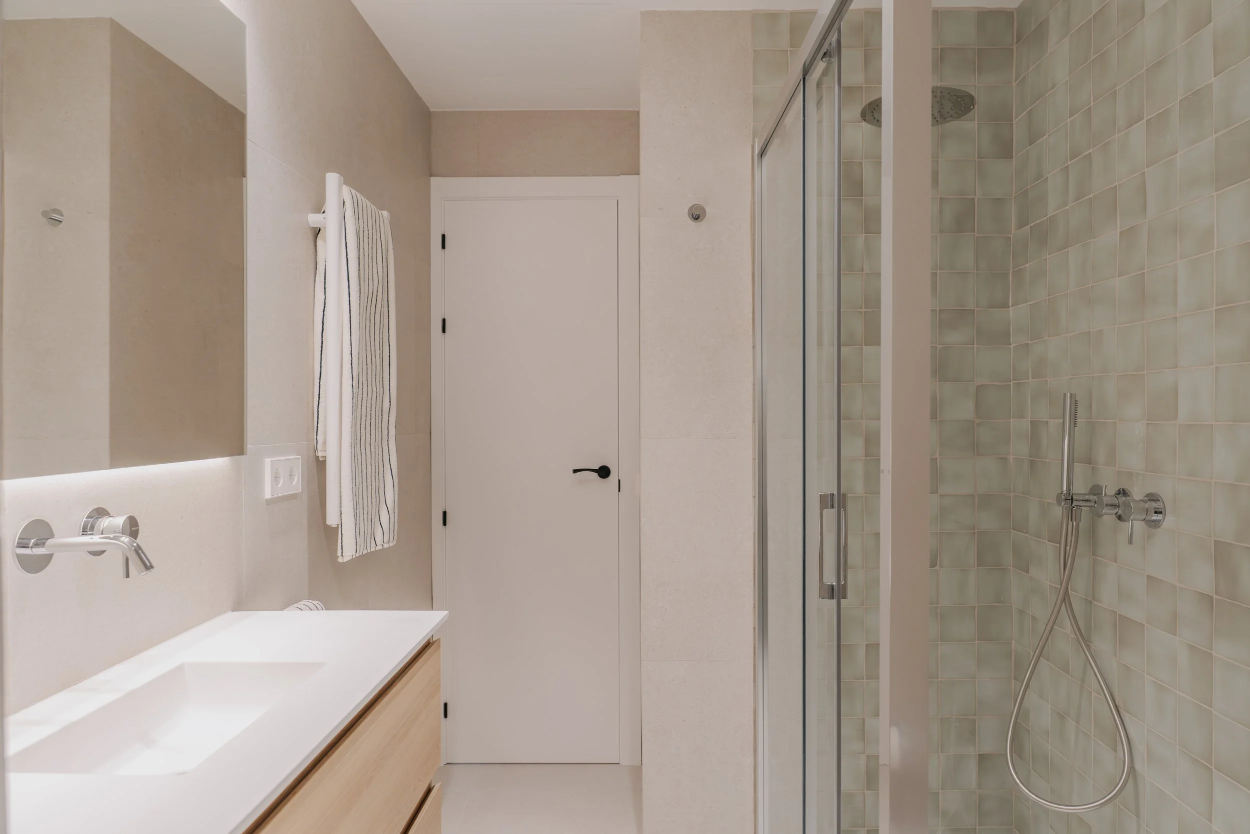 El baño original se actualiza manteniendo su ubicación, pero renovando completamente su imagen. Se utiliza el mismo alicatado en suelo y paredes para reforzar la sensación de continuidad y limpieza visual. Como elemento decorativo, el azul vuelve a aparecer en la zona de la ducha, reforzando el hilo conductor del proyecto.