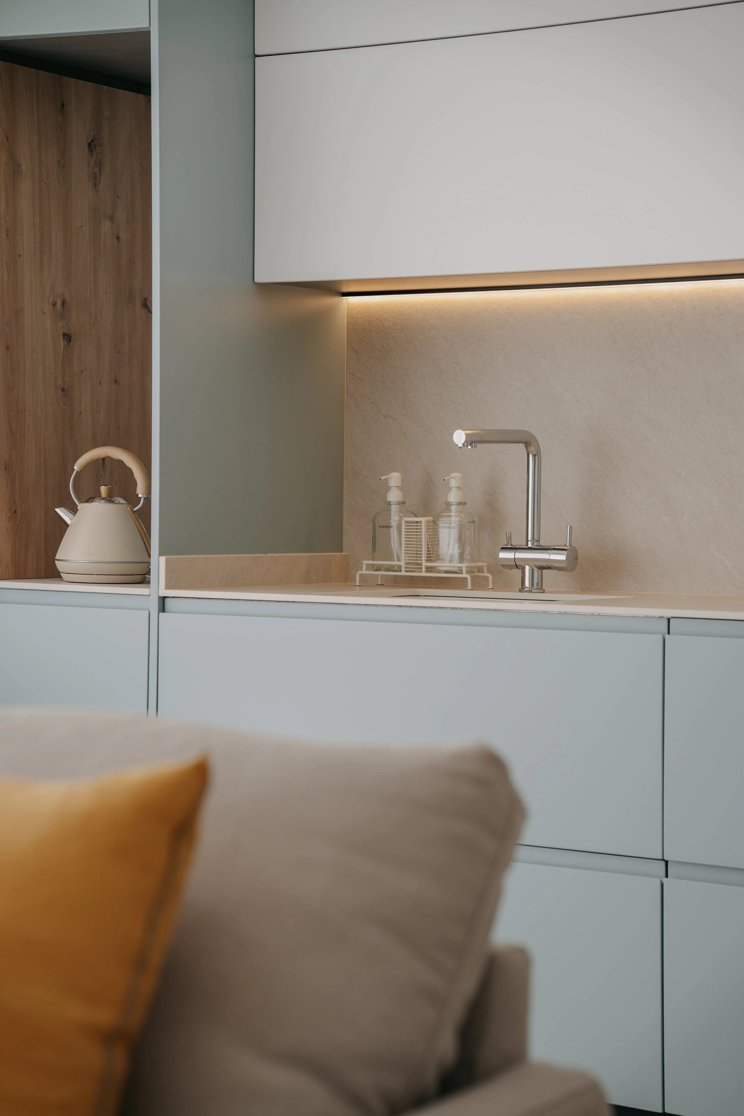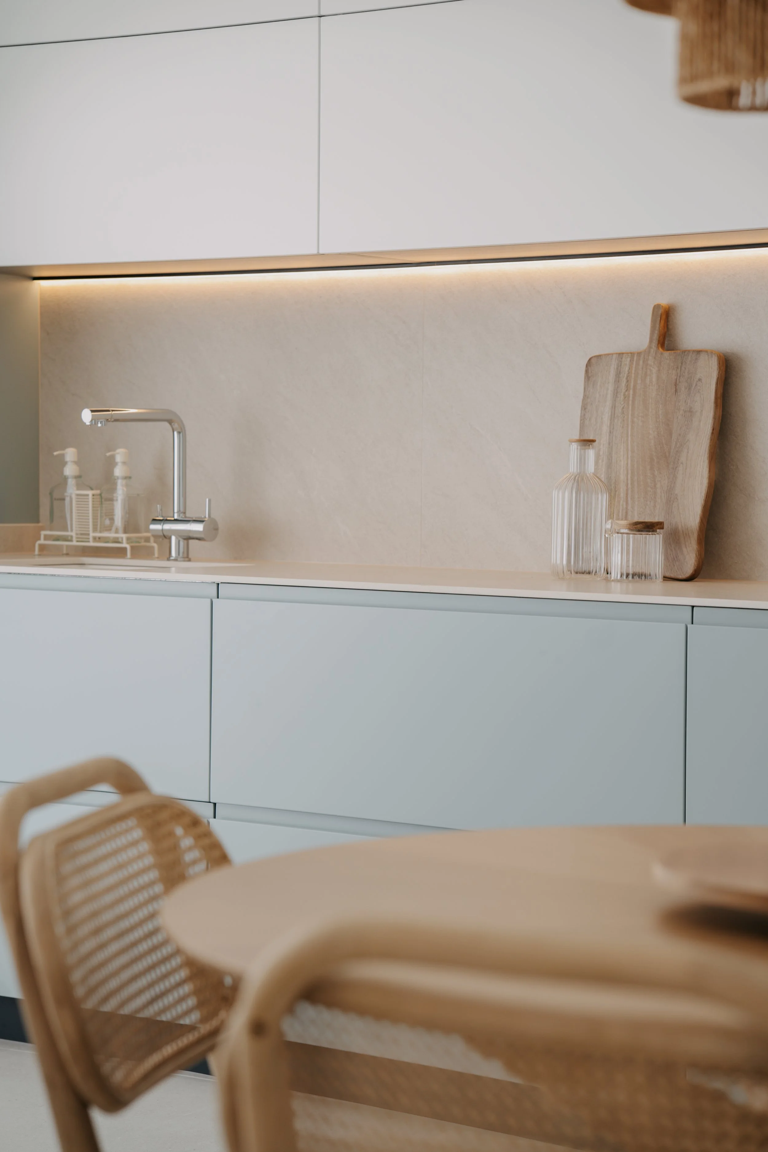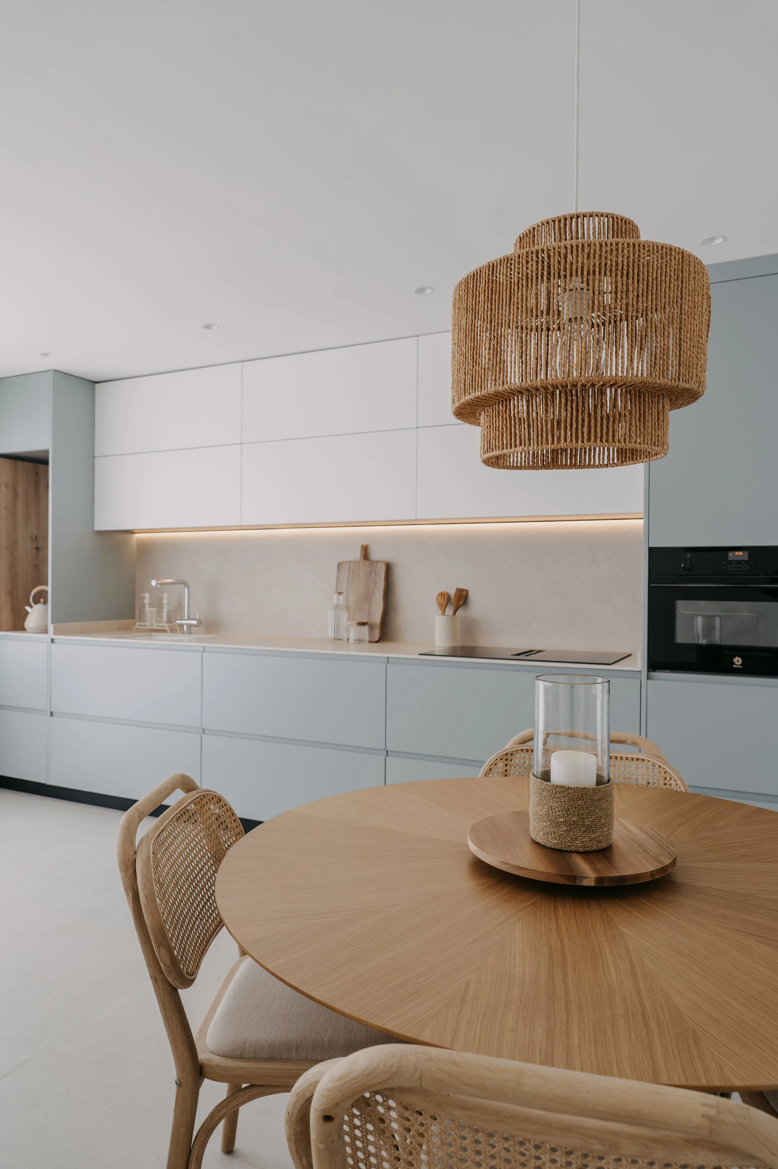 El diseño se resuelve con dos bloques de columnas que enmarcan la zona central de trabajo, generando una composición equilibrada y funcional. En este mismo frente se incorpora una pequeña zona de desayunador, pensada para el uso diario. El mobiliario se realiza en un tono verde azulado que refleja el paisaje marítimo y refuerza el carácter mediterráneo del conjunto.