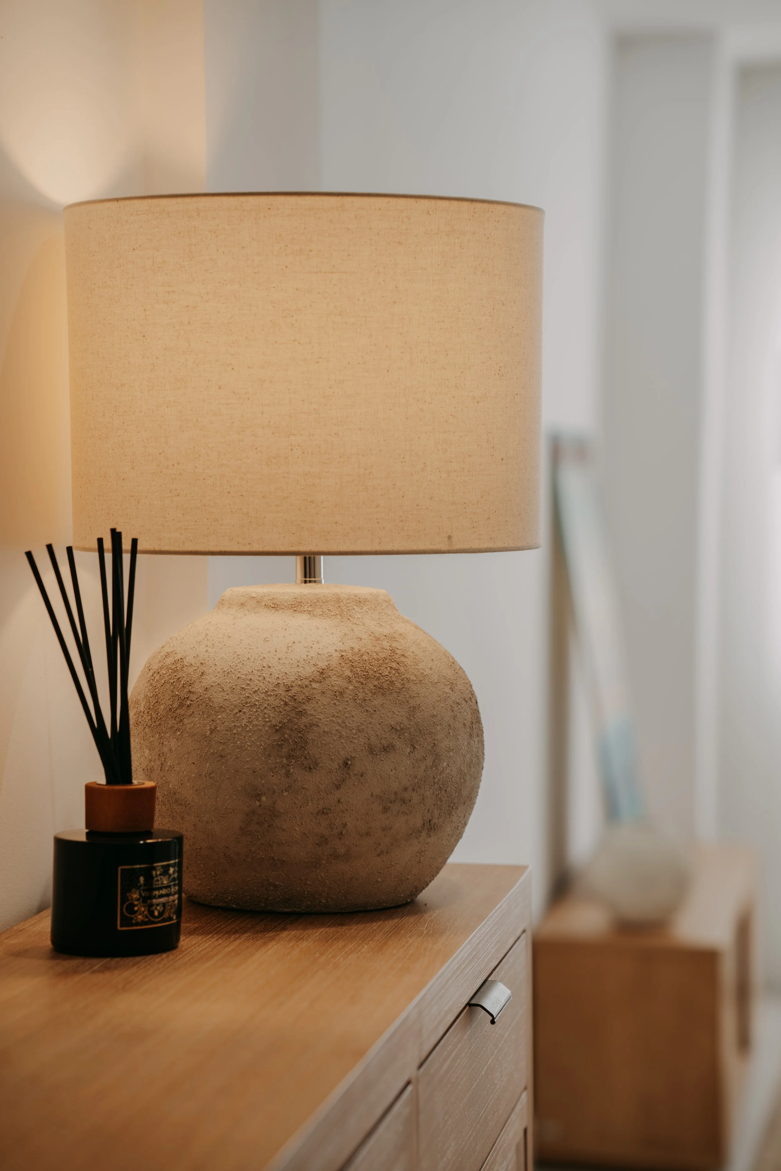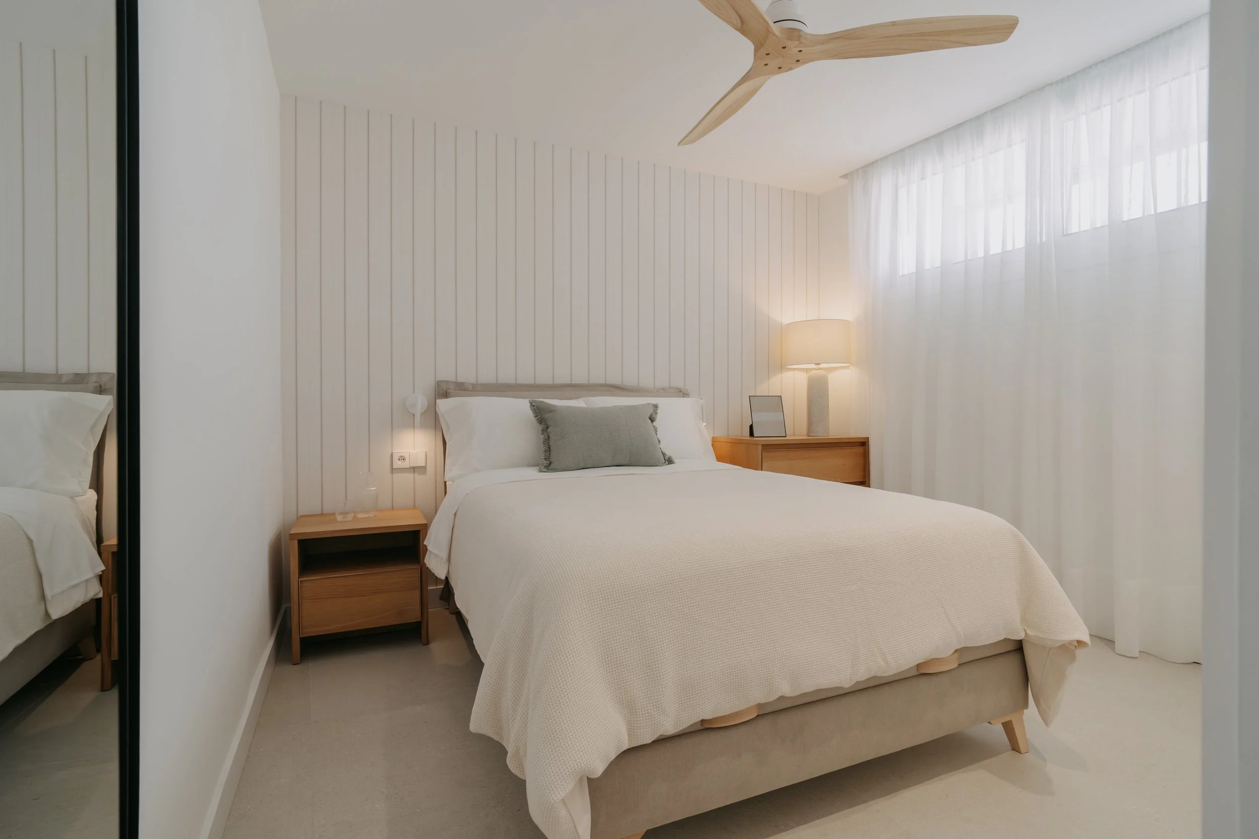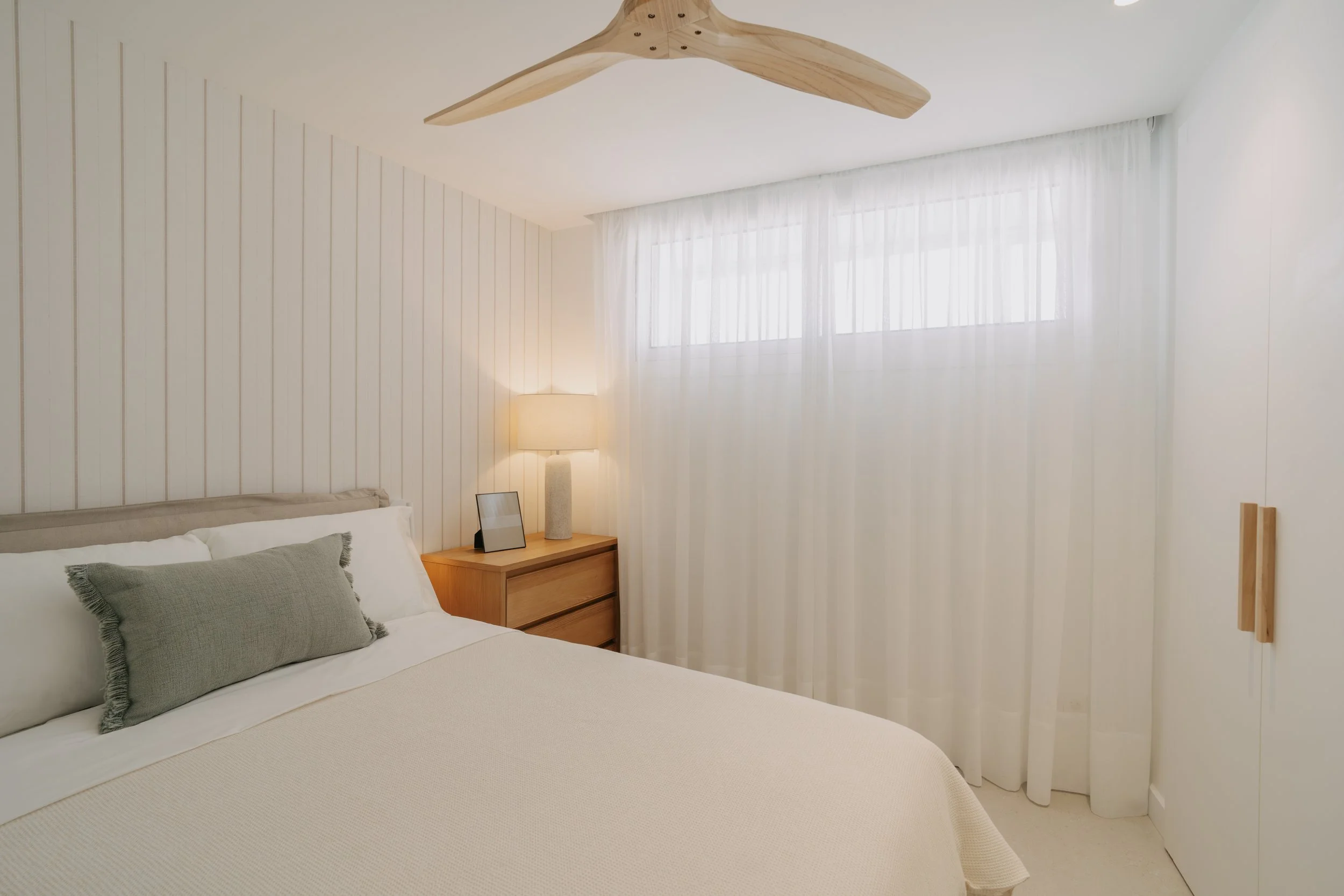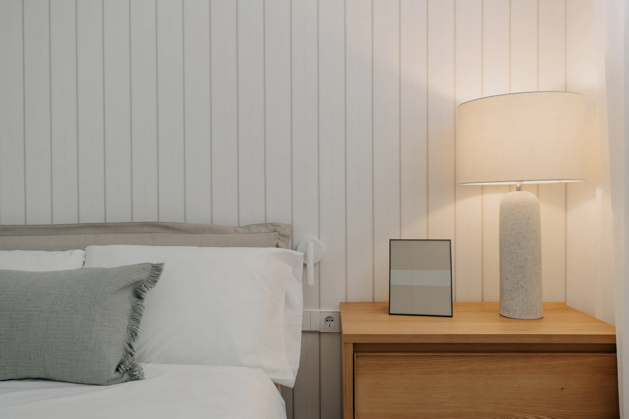 La pared principal se reviste con un papel pintado de diseño lineal en tono crudo, que aporta sensación de altura y amplitud. La cama tapizada en tonos crema, acompañada de textiles suaves y luminarias de inspiración mediterránea, completa un ambiente sereno y acogedor.