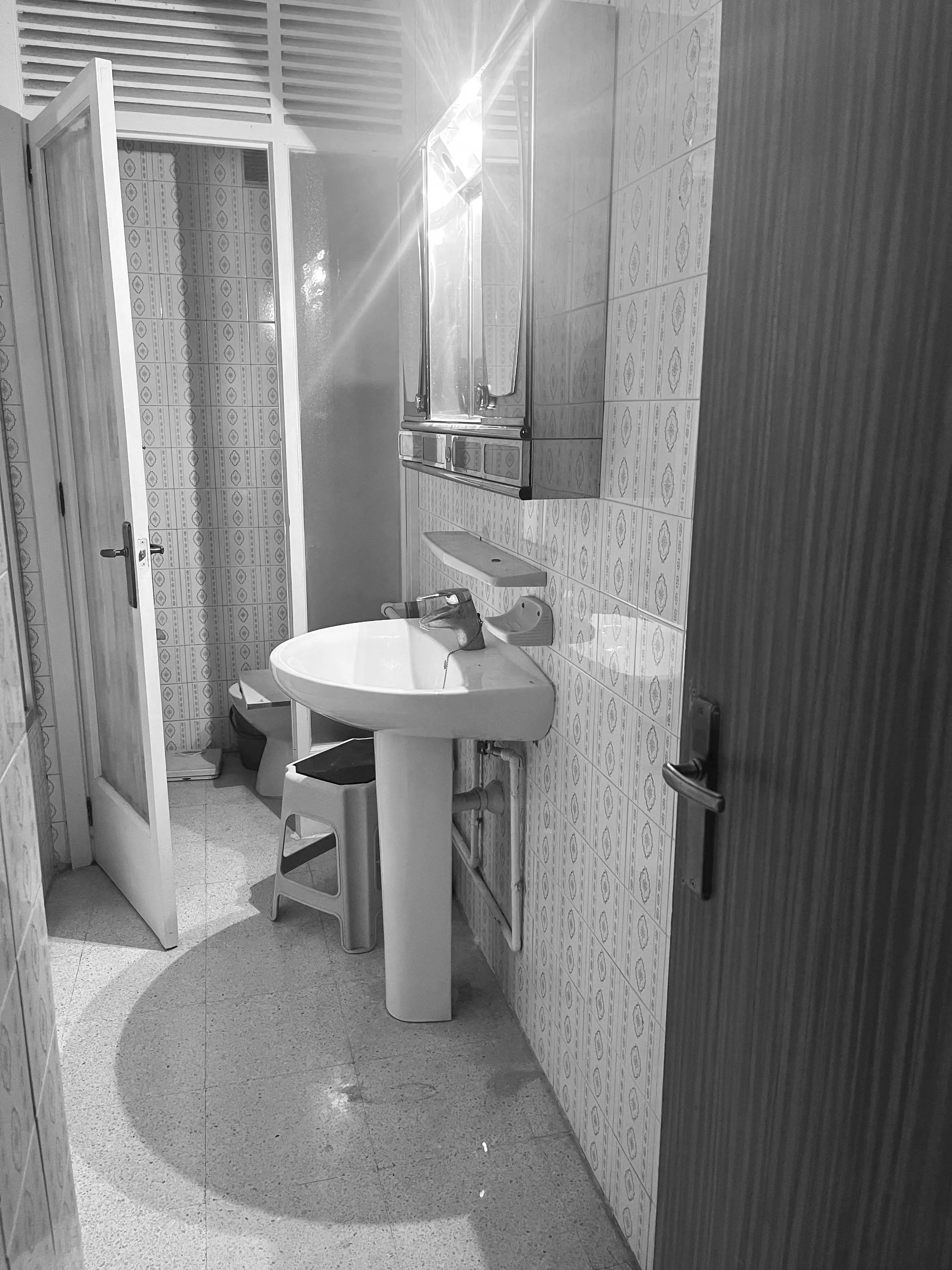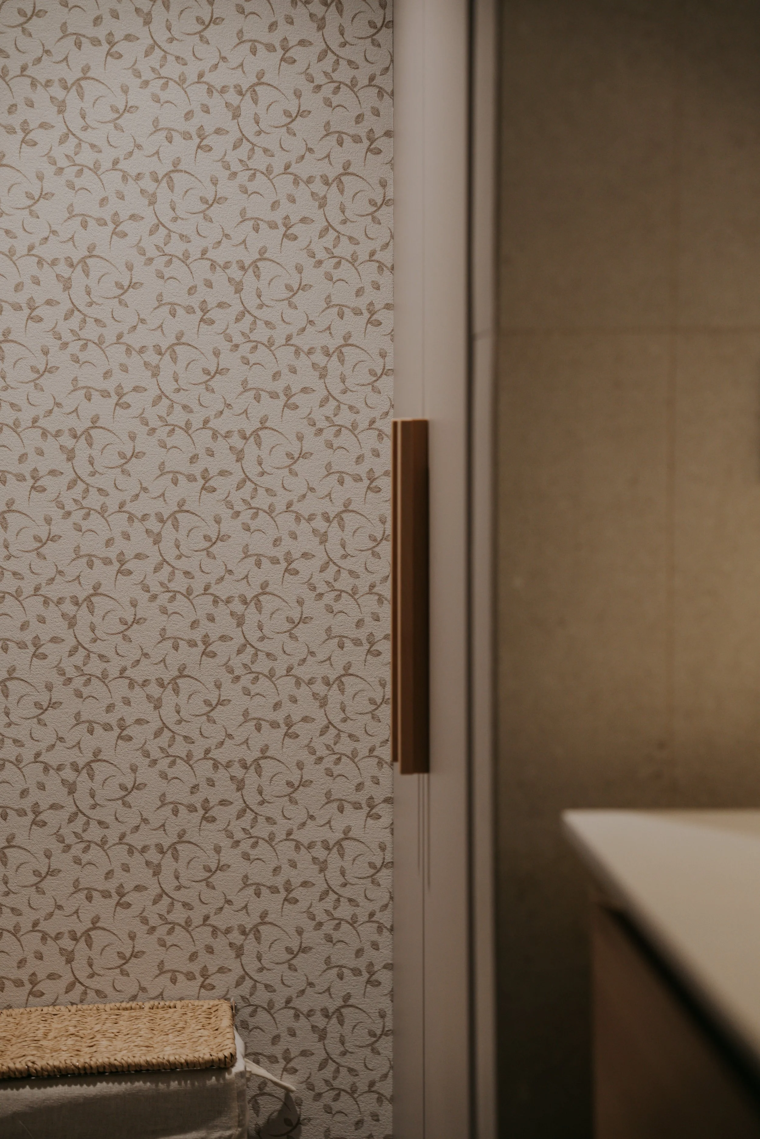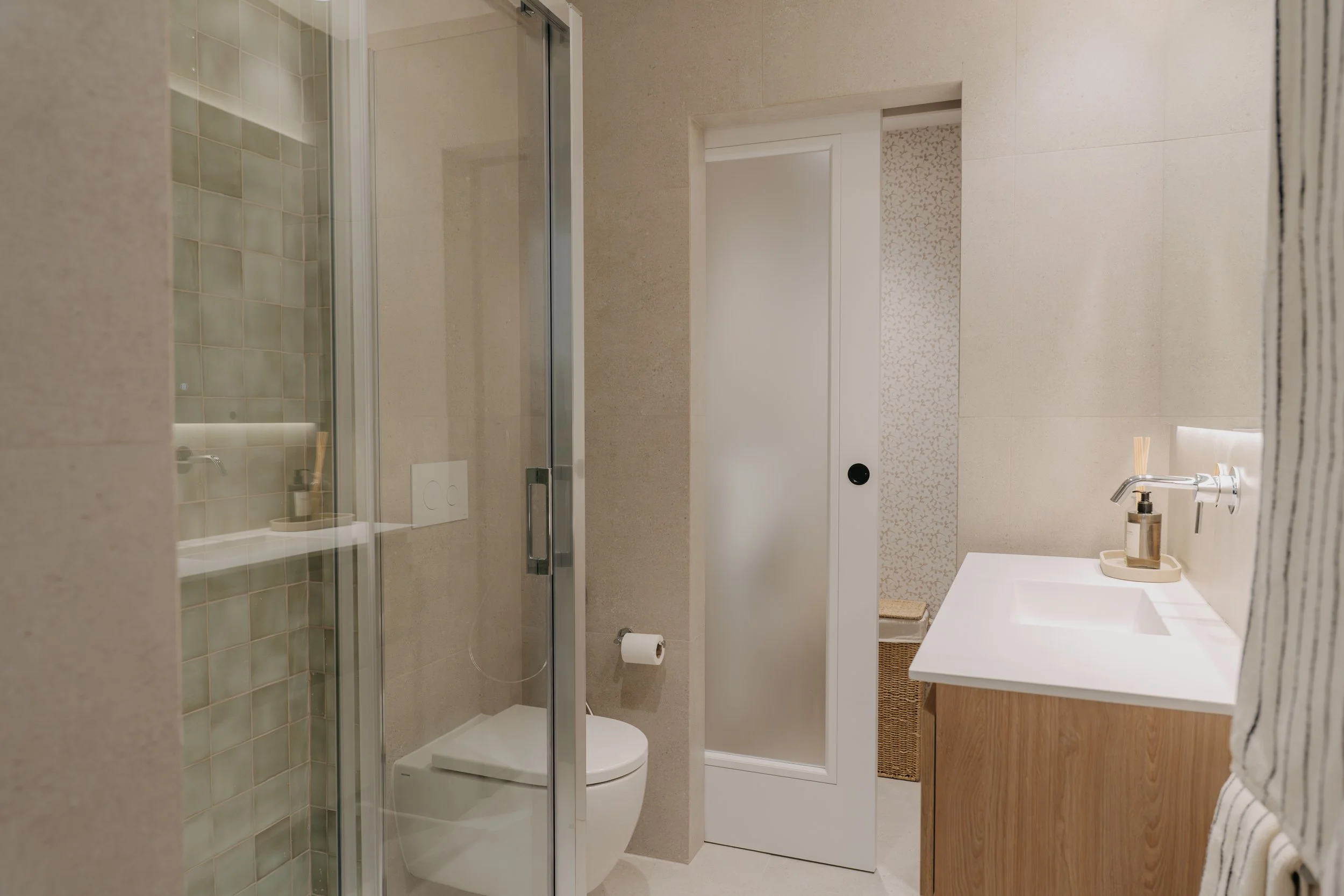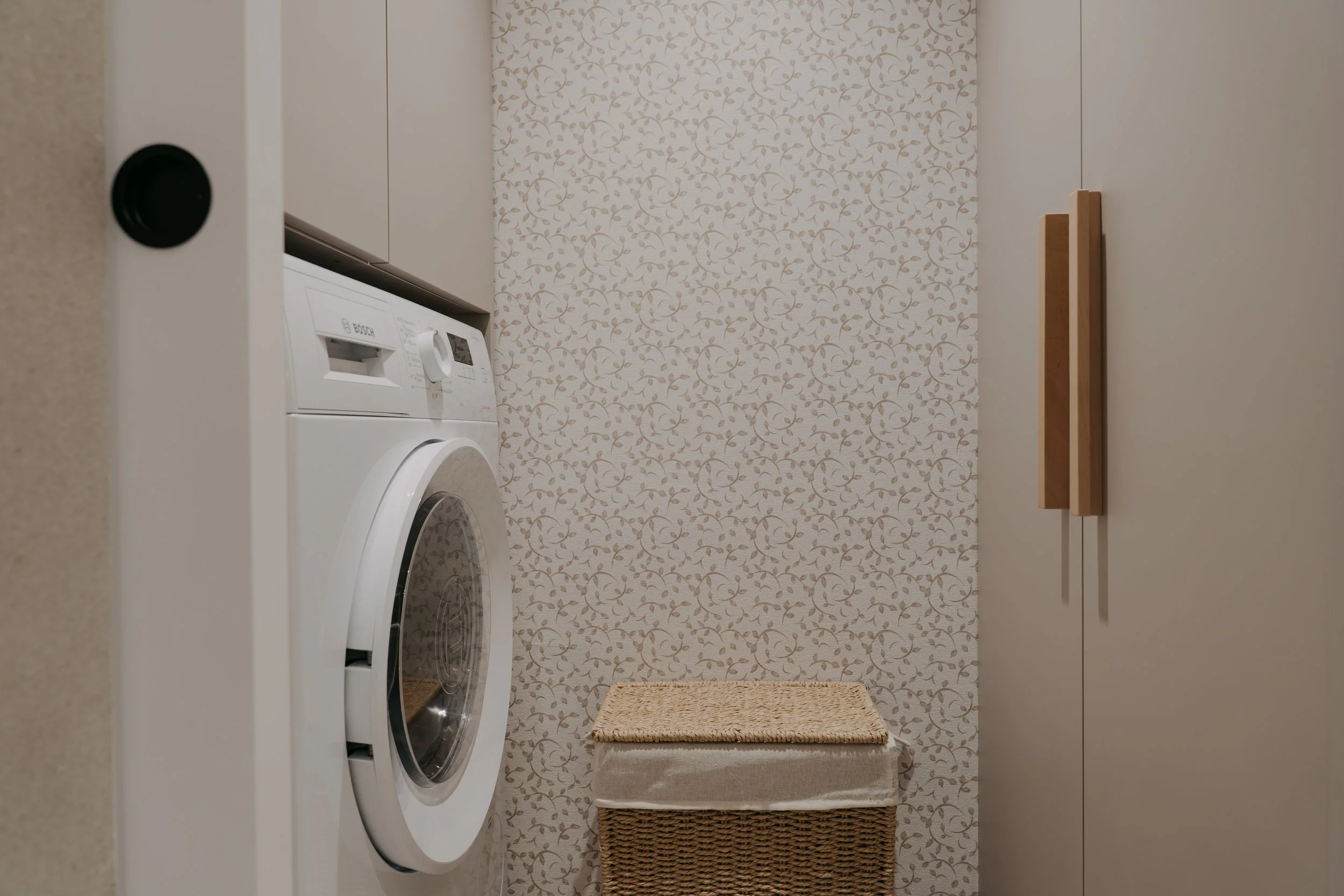 Dentro del baño se integra una pequeña zona de lavandería, separada mediante una puerta ligera que permite independizar ambos espacios sin perder continuidad. Este rincón queda totalmente integrado gracias al uso de papel decorativo como fondo, aportando textura y carácter sin recargar el conjunto.