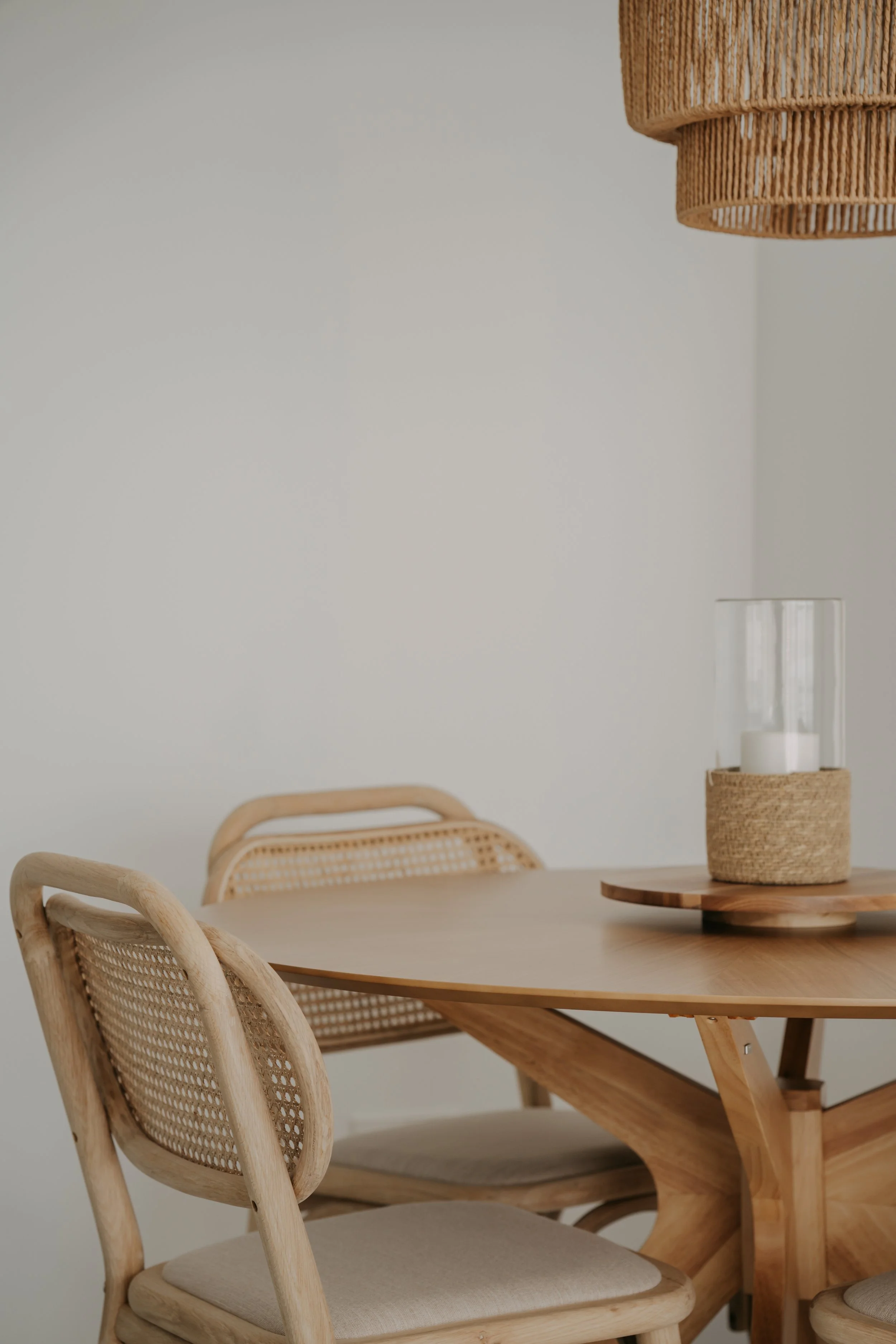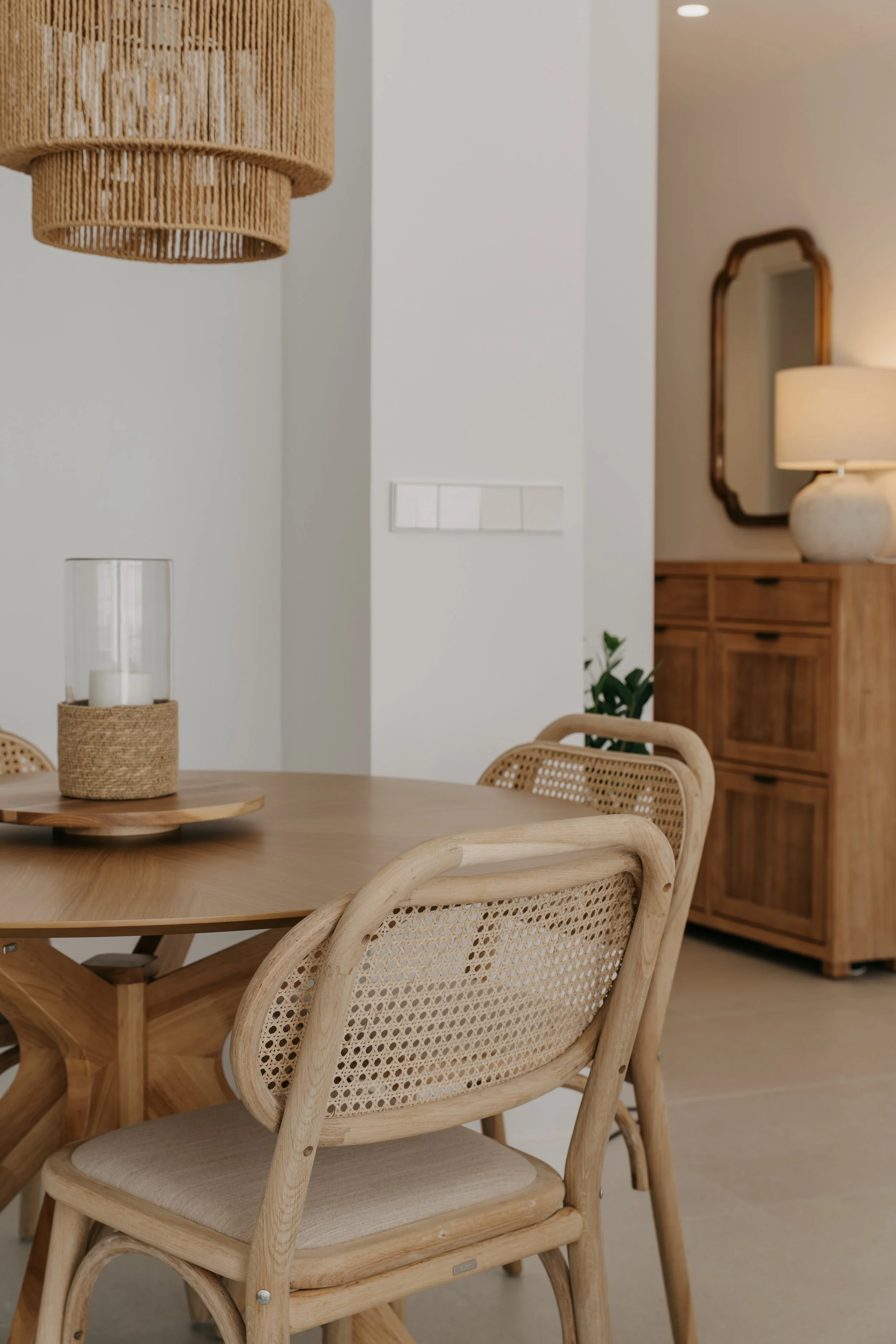 Mesa y sillas de Kave Home, lámpara de mesa de Sklum, cojines de Zara Home y de Filocolore, sofá de Moradillo, puff de Cofaneti, lámpara de pie de Maisons du monde, cuadro de @vickygomila.arte.