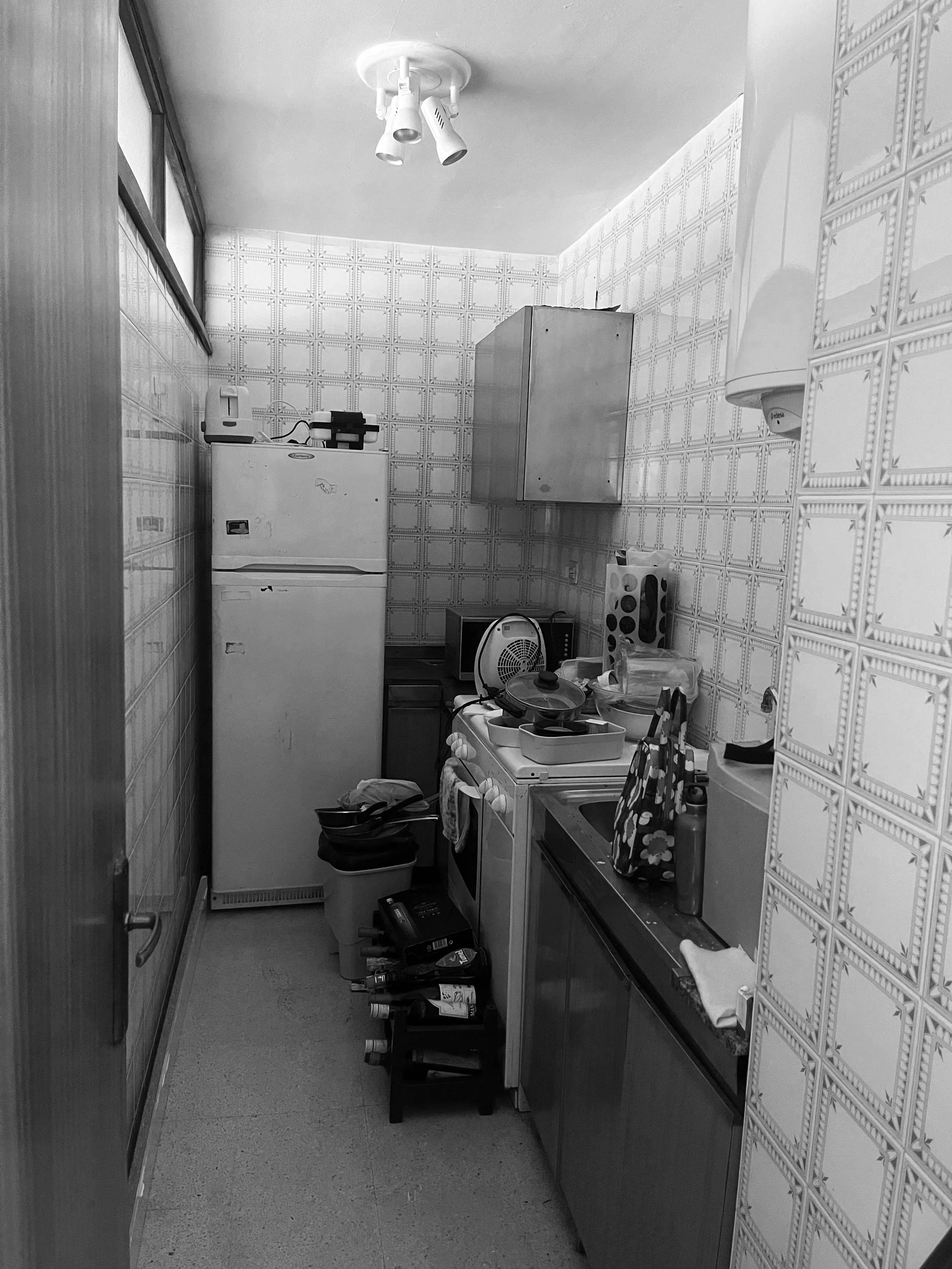 La intervención principal se concentra en la zona de día, donde se pasa de una cocina estrecha y cerrada a un espacio abierto y completamente integrado con el salón. La cocina se reubica para optimizar la distribución y ganar amplitud, configurándose como un frente lineal que organiza el espacio.