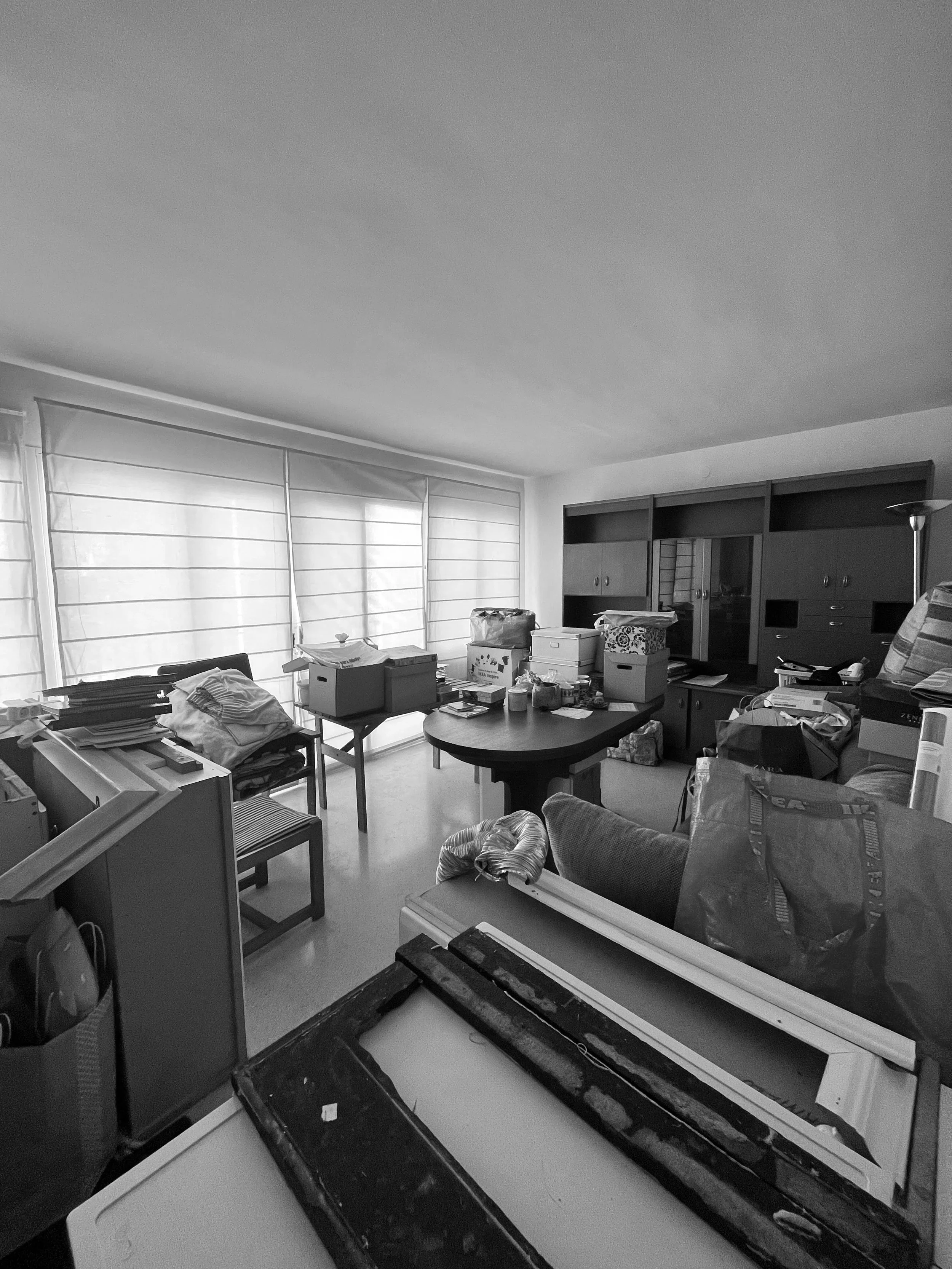 El salón se articula alrededor de esta nueva distribución, creando un espacio cómodo y luminoso, donde cada pieza de mobiliario se integra de forma natural. Se opta por sustituir la tradicional mesa de centro por un puff a medida, más flexible y ligero visualmente, que permite apoyar una bandeja y adaptarse a distintos usos. La zona de comedor, con mesa y sillas, se ubica junto a la fachada para aprovechar la entrada de luz natural.