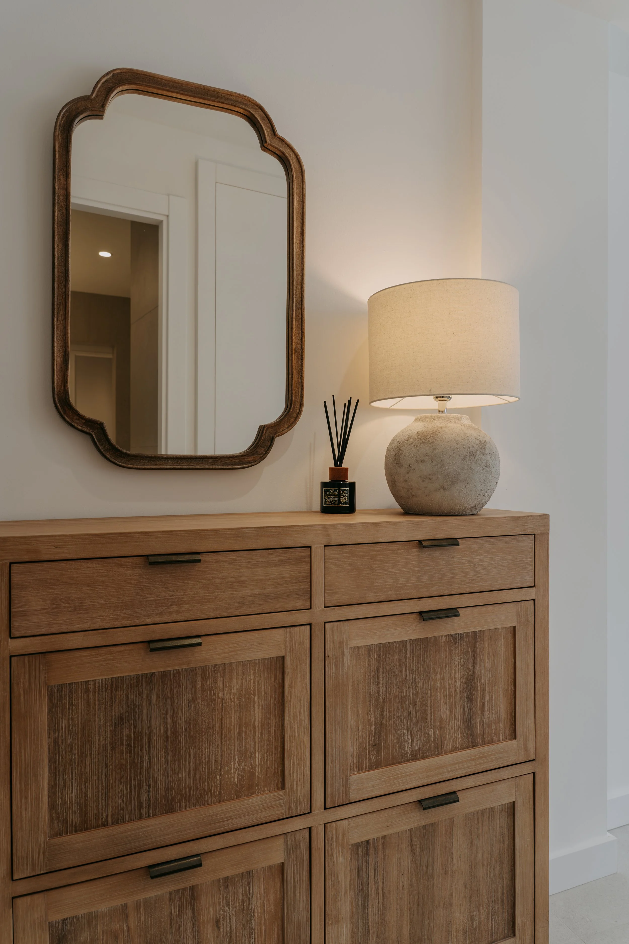 Mueble zapatero de Banak, lámpara de Sklum, espejo de El Corte Inglés.